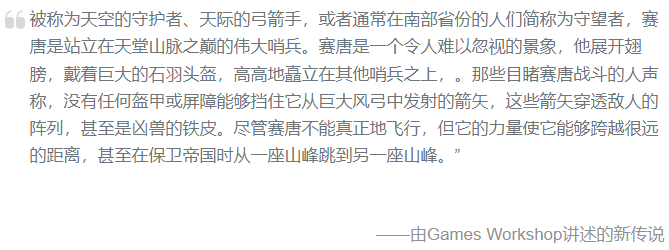 「守望者」赛唐是一位大型传奇英雄,这在《全面战争:战锤III》中(不考虑骑乘角色)很罕见。就像古墓王的骨巨人一样,赛唐使用一具巨大的魔法弓向敌人的阵线发射炮弹级别的弹药。赛唐在近战中也相对强大,具有良好的防御属性和能力来增强附近的其他构装体。作为一个构装体,赛唐虽然有强大的翅膀,但不能飞行,但可以跳跃很远的距离来接近敌人。