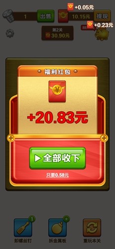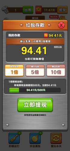 一起拧螺丝赚钱版是一款好玩的休闲闯关类手游,该游戏中玩家是进入工厂来拧螺丝,对各种关卡进行闯关,领取各种现金红包福利。玩家需要在规定时间内按照箭头指示拧完所有的螺丝,游戏难度不断升高,越来越难以完成。一起拧螺丝红包版中还有多人模式,可以与好友一起比拼,增加竞争和趣味性,游戏的画面简洁大方,能够帮助玩家放松身心,增加身体健康。