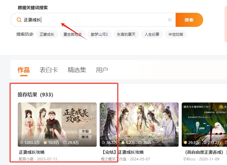 3、在搜索栏上搜索游戏名,点开作品即可。