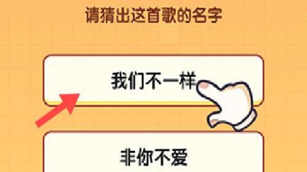2、在猜歌环节,根据提示 “请猜出这首歌的名字”,若认为答案是 “我们不一样”,点击对应选项即可进行作答。