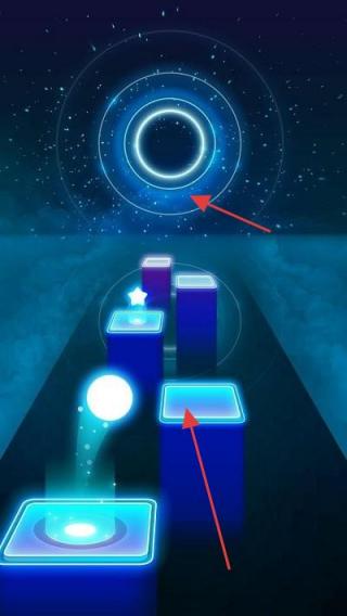 2、跳跃中途遭遇快速变换的霓虹瓷砖阵,需根据鼓点节奏连续点击屏幕,操控小球在破碎瓷砖与旋转障碍间精准落点。