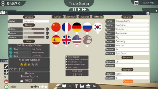 游戏中最终目标是打造一家知名且具有影响力的动漫工作室,在动漫界取得成功并赚取巨额利润。