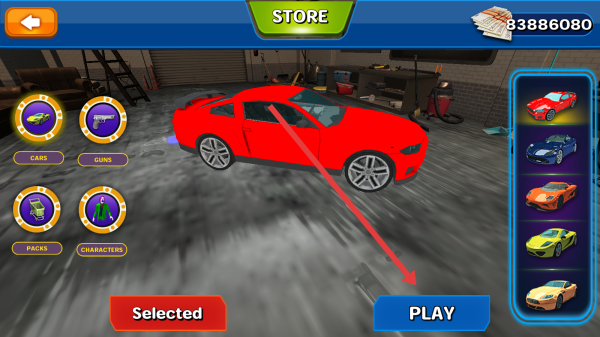 2、商店界面选定红色跑车后,点击蓝色PLAY按钮,驾驶车辆进入任务场景,利用车辆速度或性能完成目标,可随时返回商店更换载具。