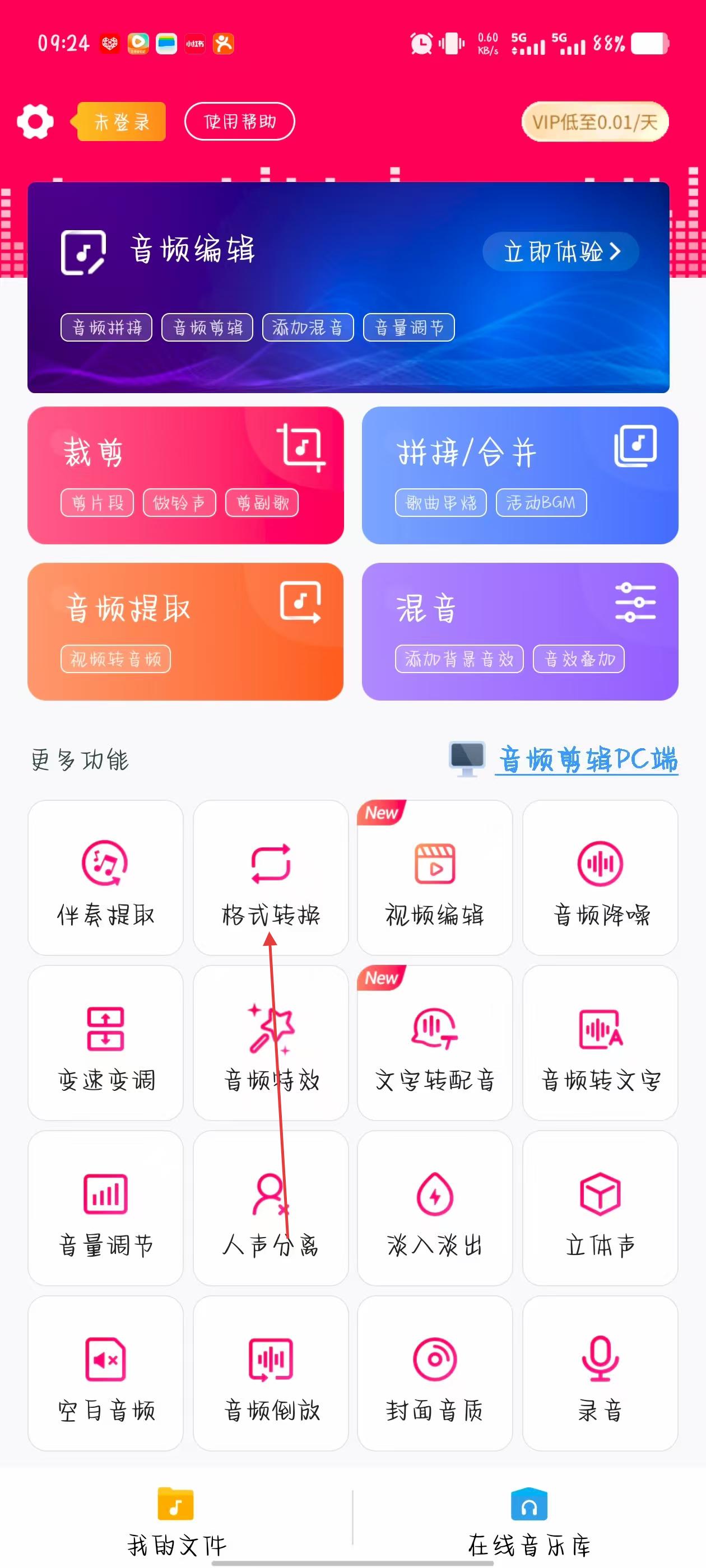1、打开音频编辑工具,在功能区中找到格式转换选项并点击,进入音频格式转换的选择界面。