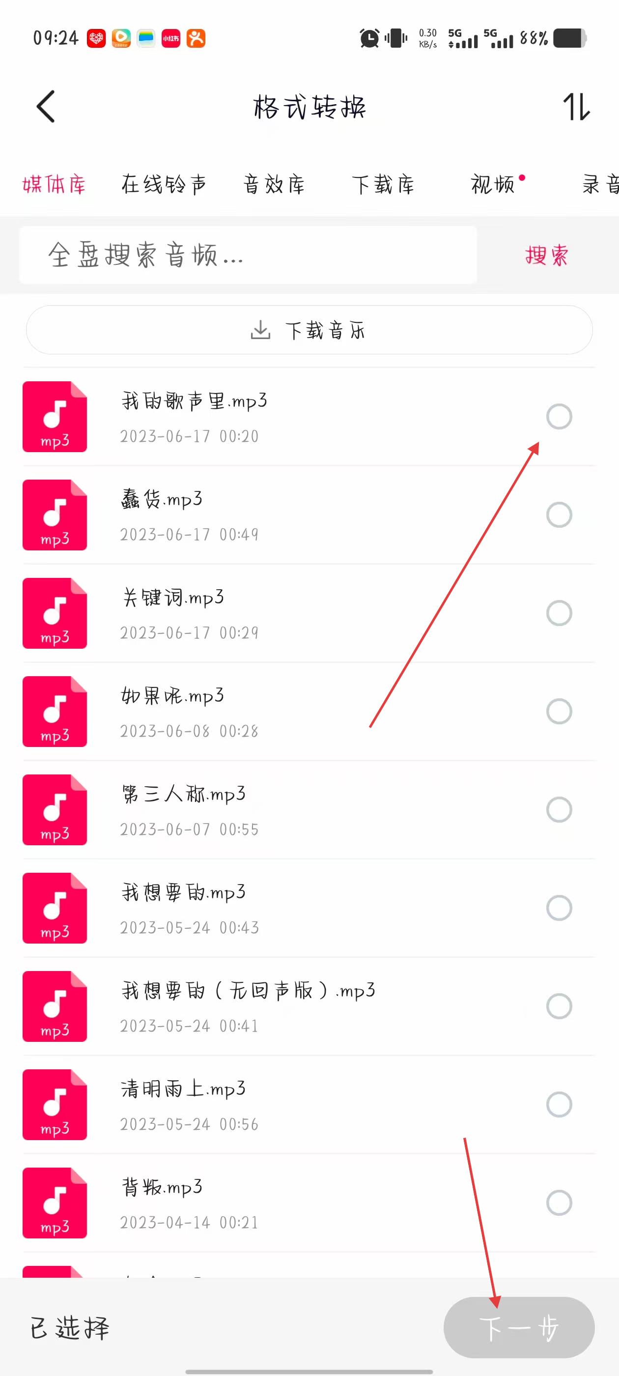 2、在格式转换界面,挑选需要转换为MP3格式的音频文件,选中目标音频后点击界面下方的下一步。