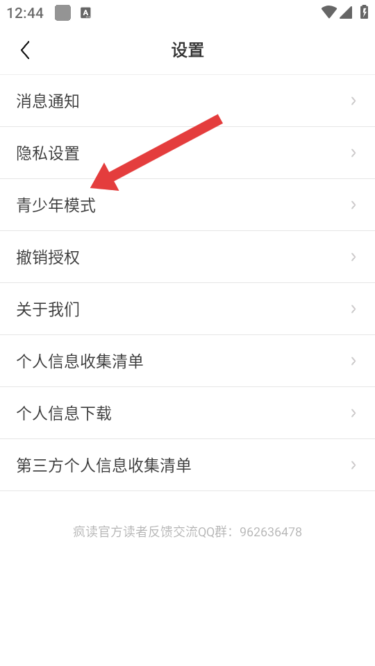 3、在设置界面,点击青少年模式选项,进入青少年模式设置页面。