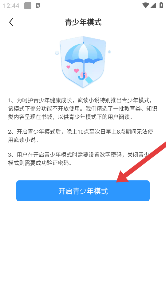 4、在页面点击开启青少年模式按钮,按提示设置密码后,即可开启青少年模式。
