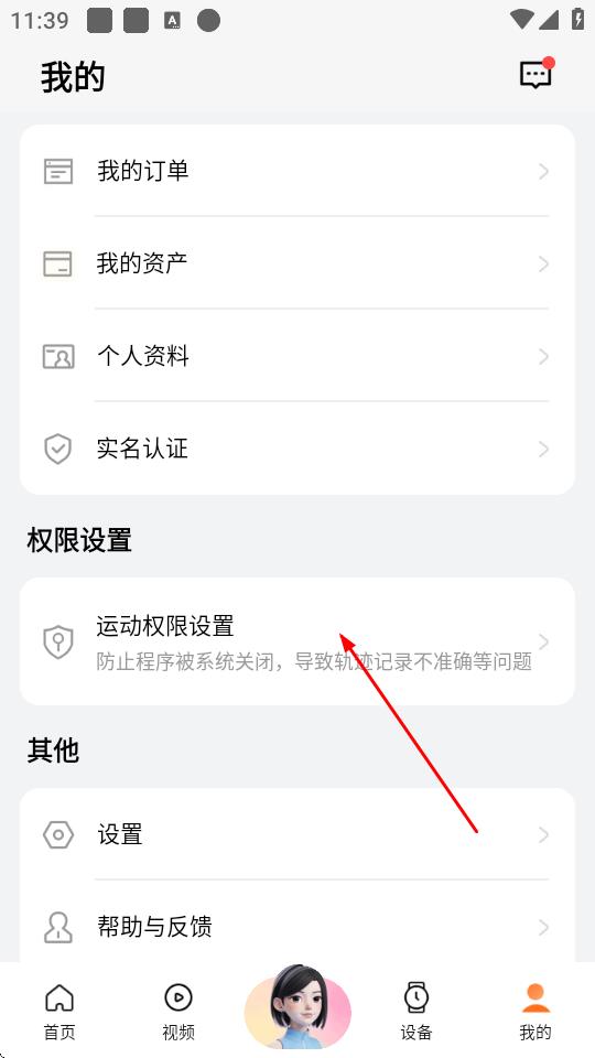 2、在“我的”页面中,找到权限设置板块,点击运动权限设置。