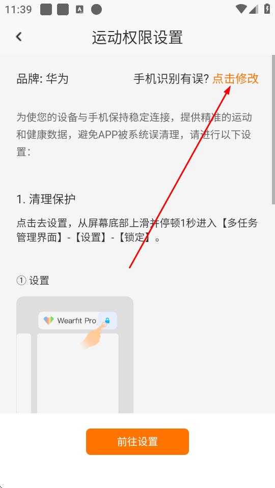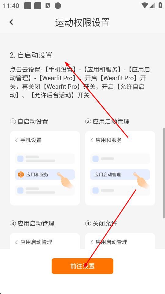 5、选择好手机品牌后,页面会显示该品牌对应的设置指引,了解自启动设置设置操作。点击前往设置按钮,完成操作。