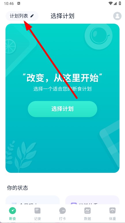 1、打开辟谷轻断食软件,点击界面左上角的计划列表。