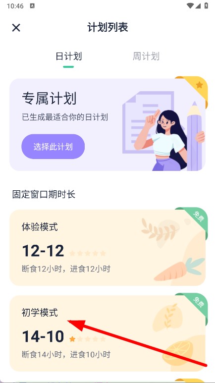 2、在计划列表页面,选择14-10初学模式的断食计划。
