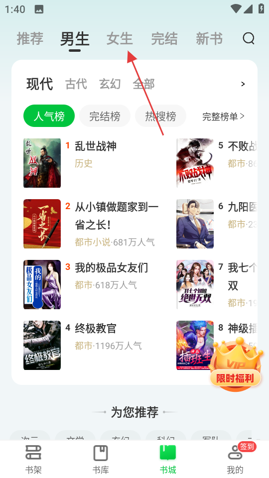 1、在书城页面,点击女生标签,查看女生频道下的各类小说。