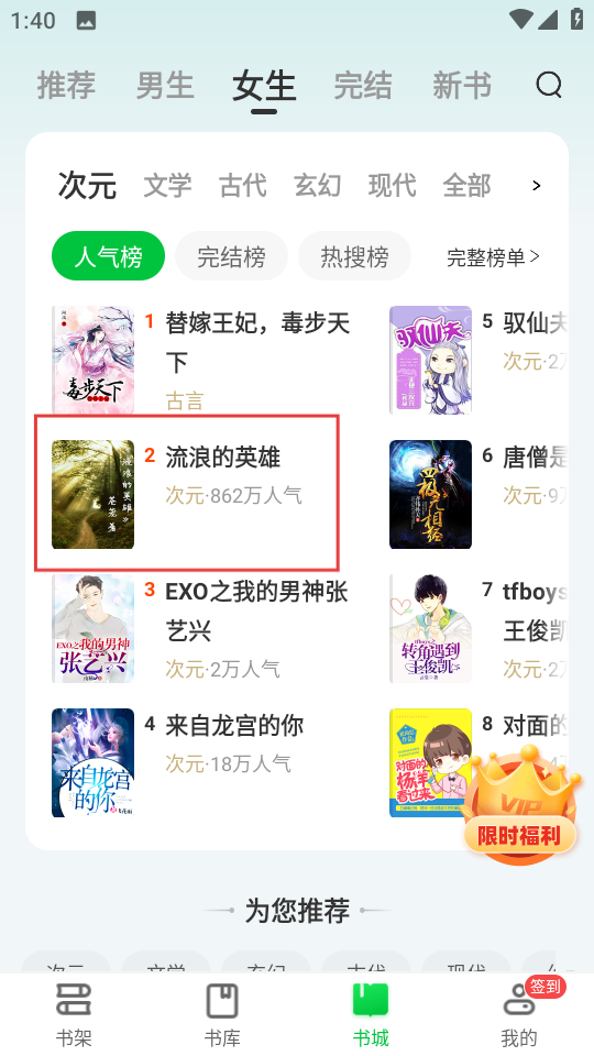 2、在女生频道的小说,点击自己喜欢的小说如流浪的英雄进入。