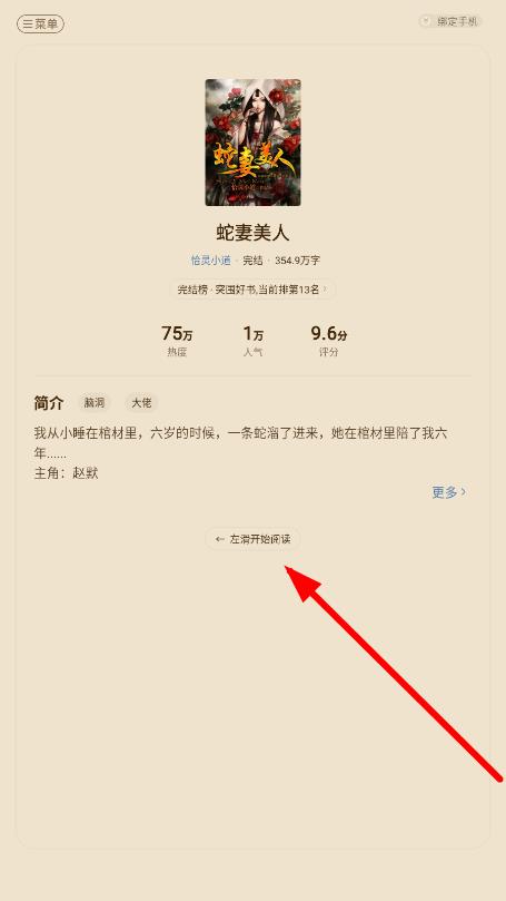 2、点击进入小说详情页,点击左滑开始阅读进入阅读界面。