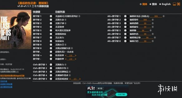 >>>最后生还者重制版v1.0-v1.1.1二十六项修改器风灵月影版