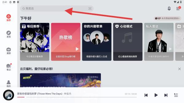 1、打开网易云音乐APP,在首页顶部或任意页面的顶部栏找到搜索框,显示搜索歌手、歌曲、专辑提示文字。