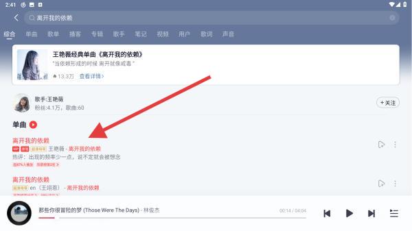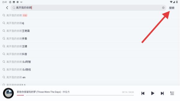 2、用户搜索关键词时可以直接搜歌名、歌手名、专辑名,点击搜索后可马上开始搜索相关的歌曲。