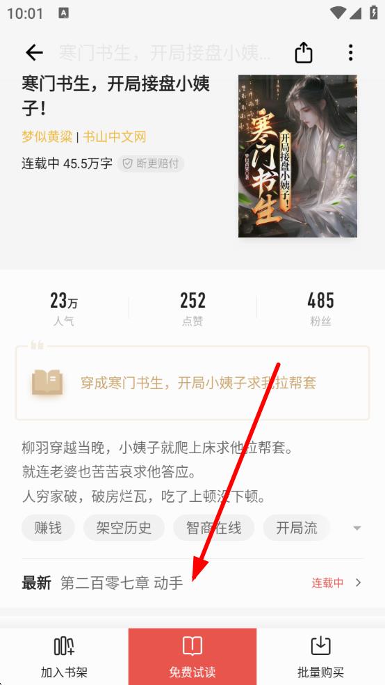 1、进入掌阅,在小说详情页点击免费试读进入阅读界面。
