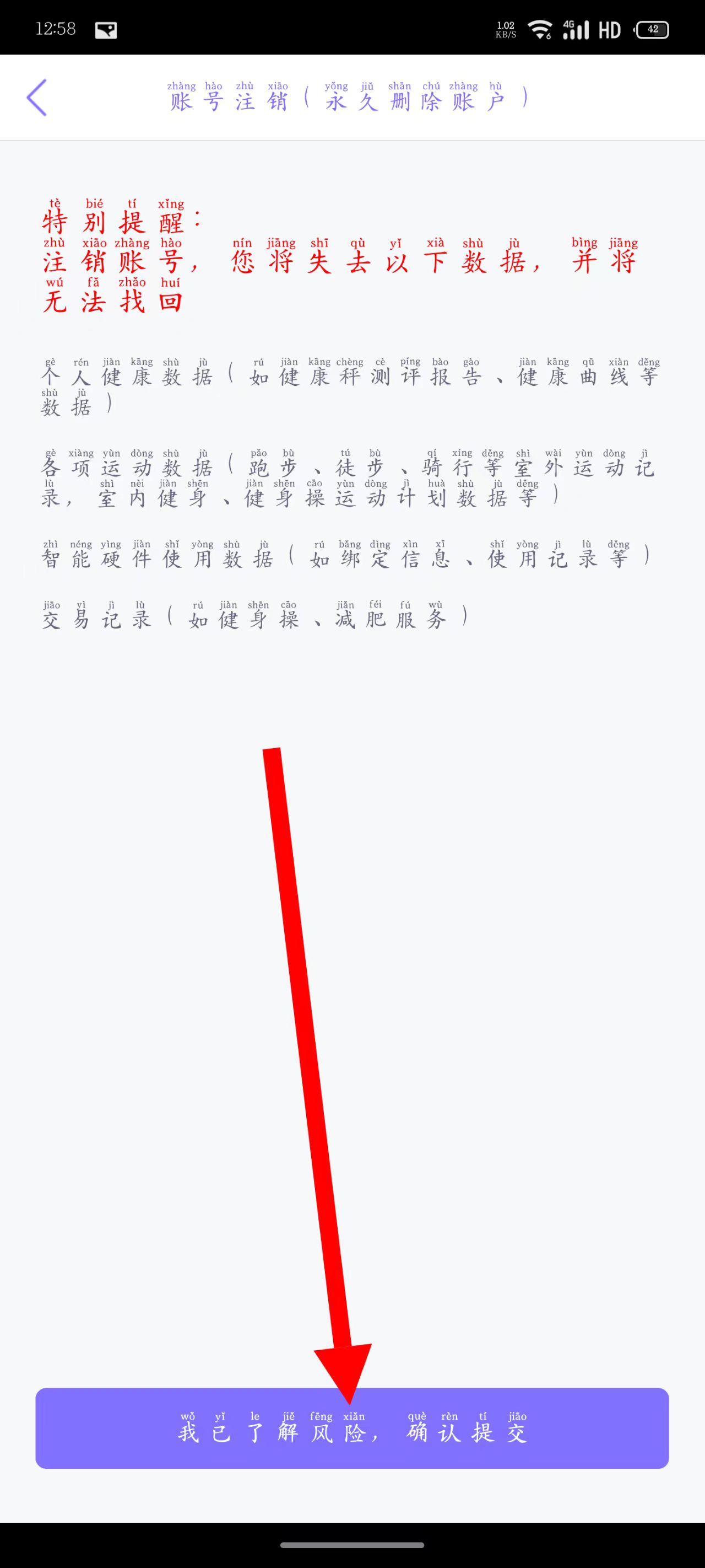 4、点击我已了解风险,确认提交,按照提示完成账号注销操作。