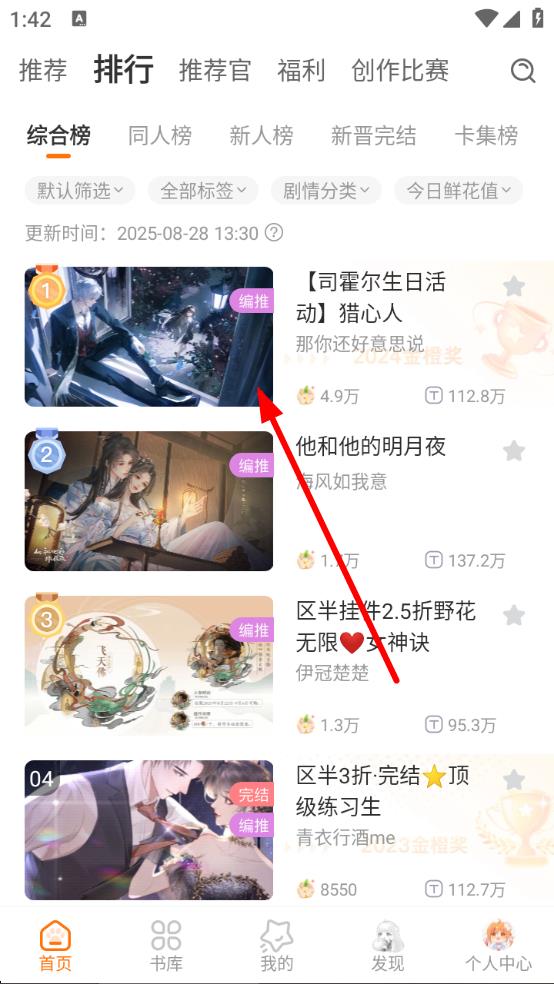 1、打开橙光APP,点击下方排行进入排行榜,选择感兴趣的作品如箭头所指的作品。