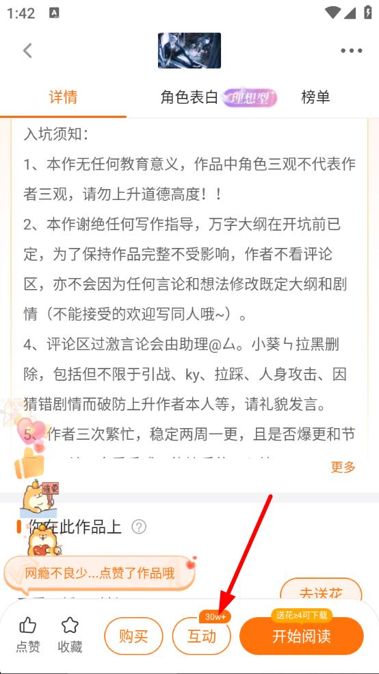 2、进入作品详情页面后,找到并点击互动按钮,进入互动区界面。