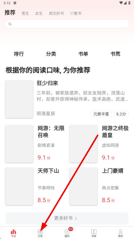 1、打开追书神器进入书城页面,点击底部导航栏中的分类选项。