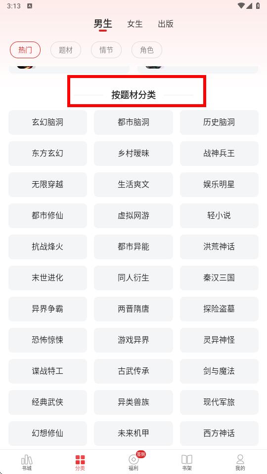2、在分类页面中,点击按题材分类栏,此时会展示众多题材选项。