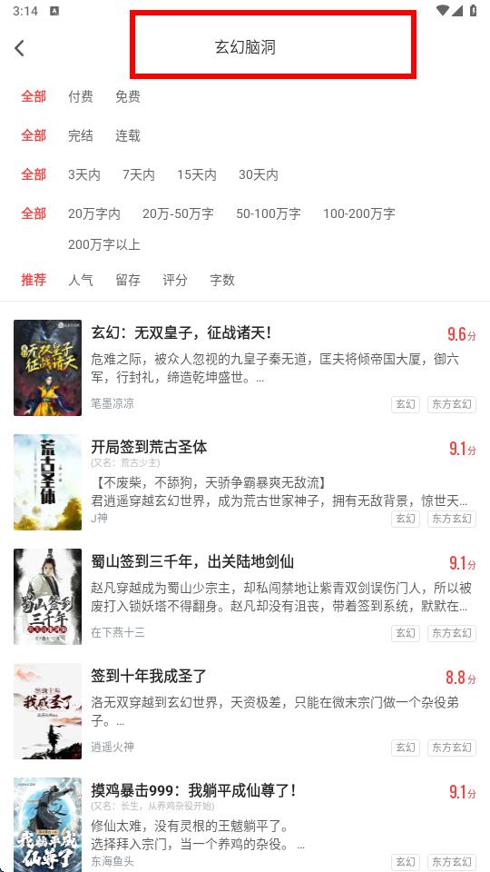 3、点击感兴趣的题材,比如玄幻脑洞,进入该题材页面后,即可浏览该题材下的各类书籍。