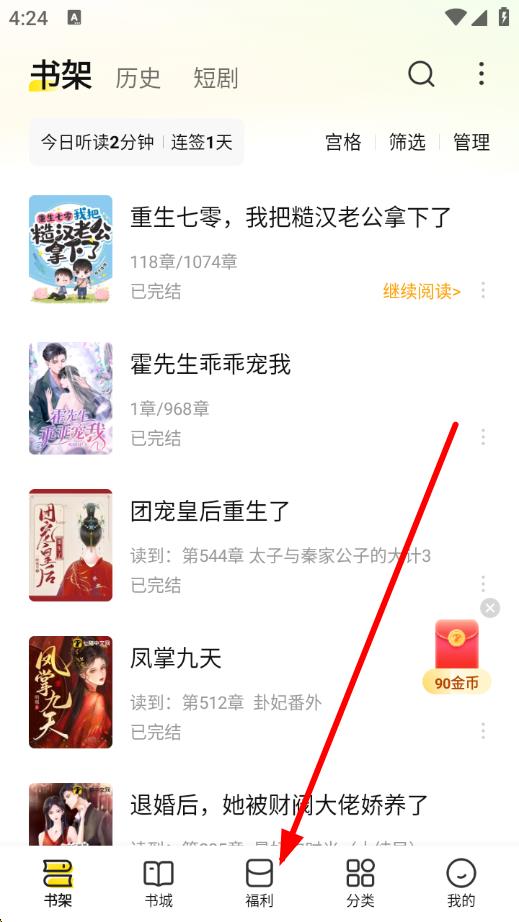 1、打开七猫小说APP,点击底部导航栏中的福利选项,进入福利界面,这里有阅读和听书赚取金币的任务入口。