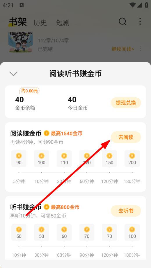 2、在阅读赚金币板块,点击去阅读按钮,按照要求阅读小说,阅读达到指定时长,比如5分钟、10分钟等,就能领取对应的金币奖励,最高可赚1540金币。