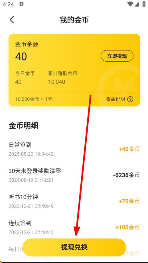 3、积累一定数量的金币后,返回福利界面,点击金币余额旁的提现兑换,或者在我的金币页面点击底部的提现兑换,按提示操作将金币提现,10,000金币约等于1元。