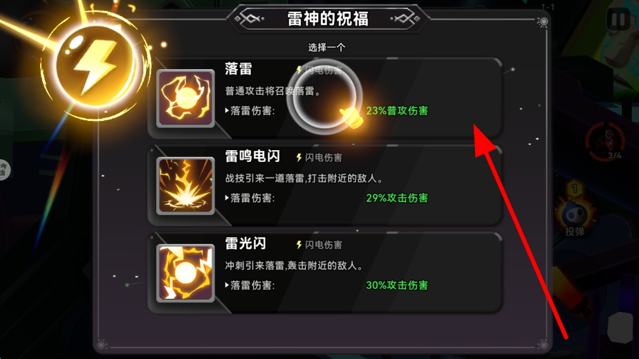 4、冒险过程中出现技能选择,像雷神的祝福技能,根据战斗需求与技能效果,选择合适的技能,增强角色实力,更好地应对后续冒险挑战。