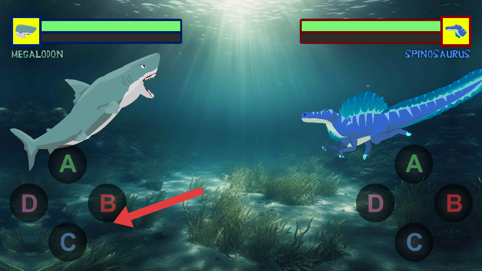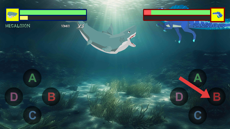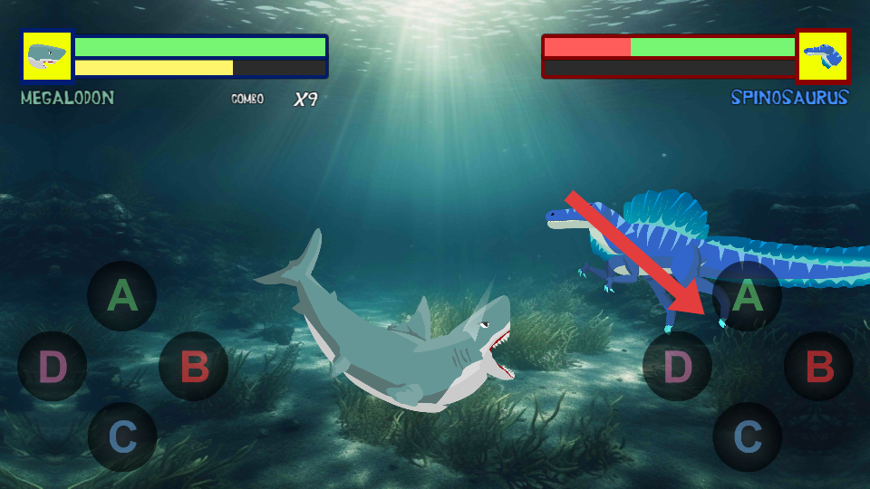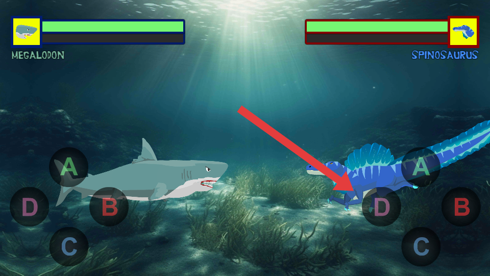 1、进入水下格斗场景后,先选择操控巨齿鲨或棘龙,通过方向键控制角色在水中移动,配合A、B键练习基础攻击。