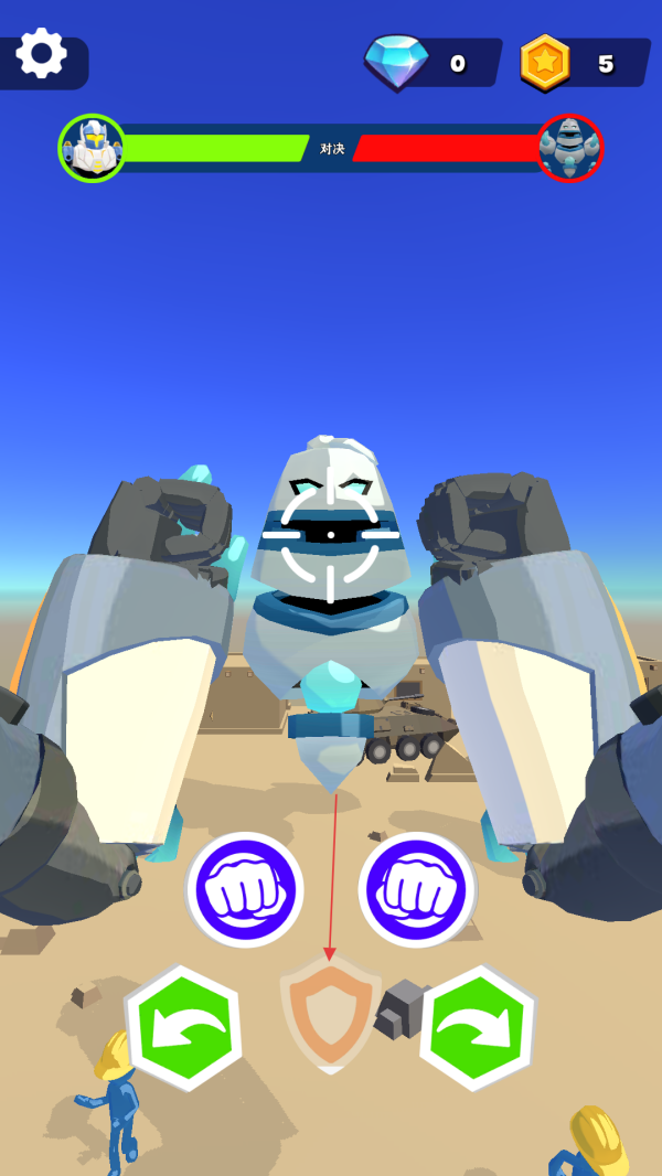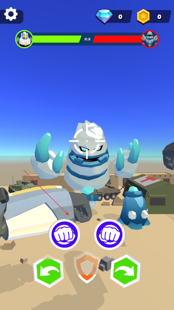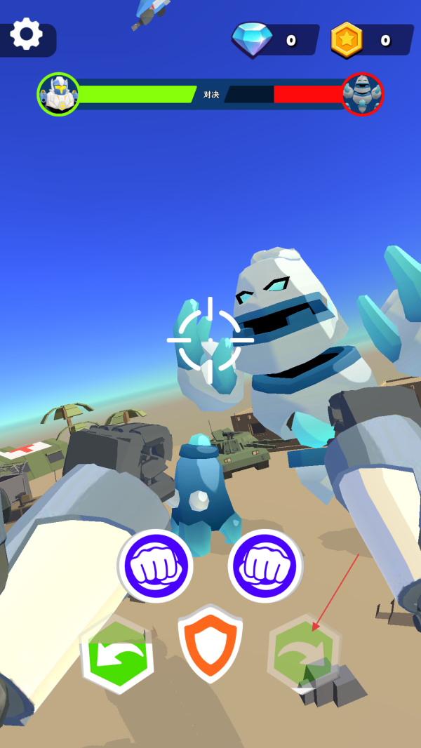 1、进入机甲军团格斗游戏对战界面后上方绿色和红色长条分别是己方和敌方血量点击屏幕下方蓝色拳头按钮操控机甲发动攻击。