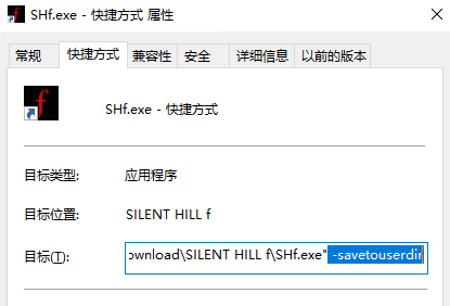 创建“SHf.exe”的快捷方式—属性—目标—末尾添加游戏运行参数(“-”前有空格):-savetouserdir