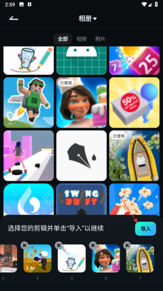 3、进入相册界面后,挑选需要嵌入该模板的素材,选好素材后点击导入按钮。
