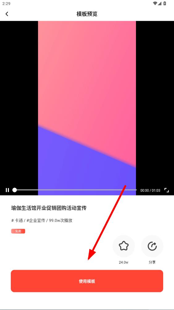 4、在模板预览页面,确认模板符合需求后,点击下方使用模板按钮,即可基于该模板开始创作。