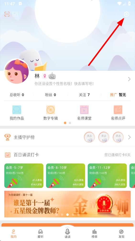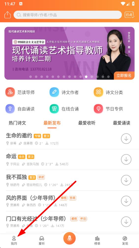1、打开为你诵读app,点击底部导航栏中的我的选项,进入个人页面。
