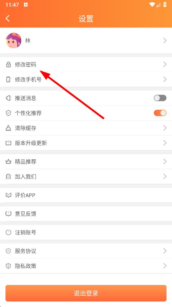 3、在设置界面里,找到并点击修改密码选项,进入修改密码页面。
