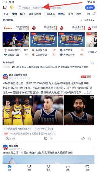 1、打开腾讯体育APP,点击首页顶部搜索栏,唤起搜索输入框。