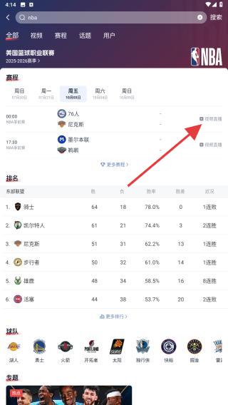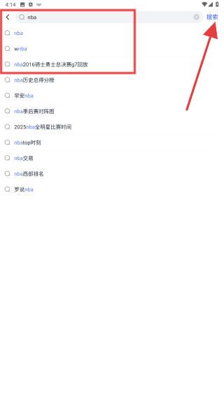 2、根据需求输入精准的关键词,例如:nba,会跳出相关的内容,也可直接点击搜索的按钮。