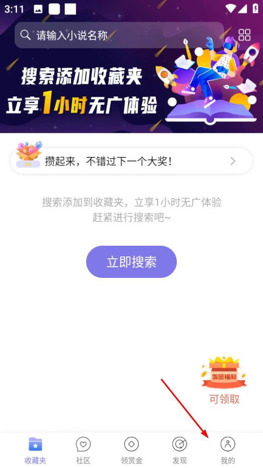 1、打开饭团探书,点击页面右下角的我的,进入个人页面。