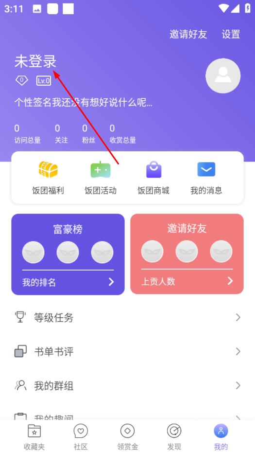 2、在饭团探书个人页面,点击未登录,进入登录界面。