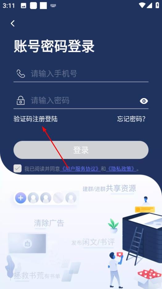 3、在登录界面,点击验证码注册登陆,切换到注册登录页面。