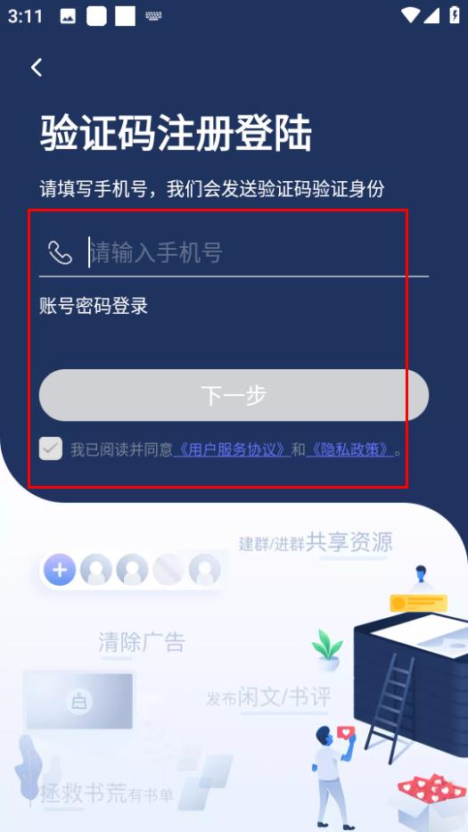 4、输入手机号,勾选同意协议后,点击下一步完成注册流程。