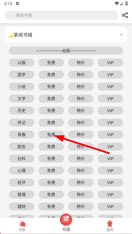 2、在书源页面,找到青春分类下的免费选项并点击。