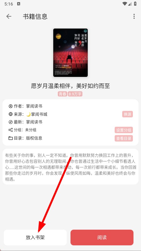 4、进入书籍信息页面后,点击放入书架,即可将小说加入书架以便后续阅读。