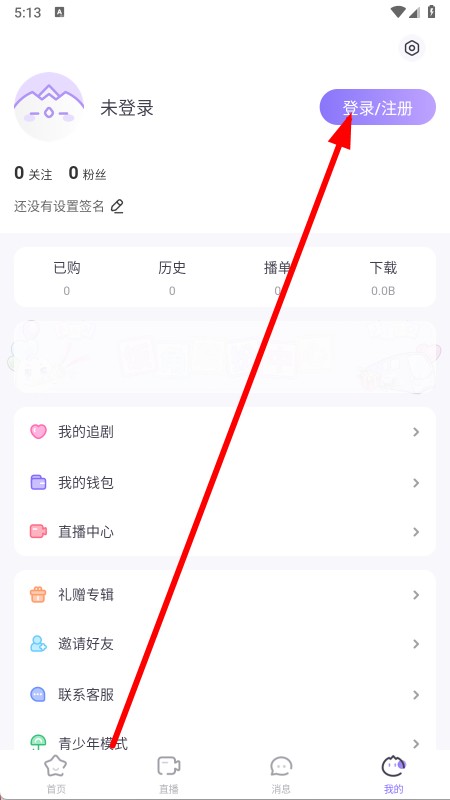 2、在我的页面,点击登录注册。