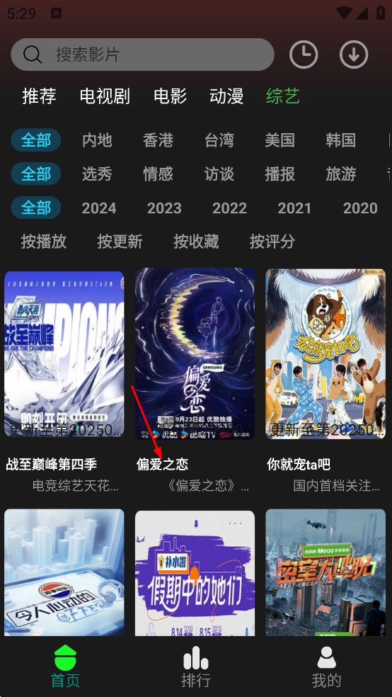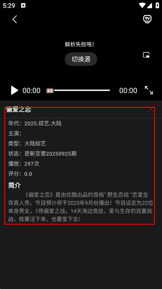 4、在播放页面,可查看偏爱之恋的年代、类型、状态等信息及简介。