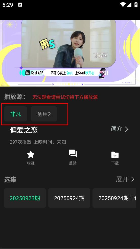 3、在偏爱之恋播放页面,可选择播放源,如非凡或备用2。